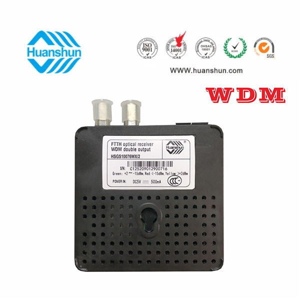 WDM型雙輸出光接收機(jī) | HSGS10076WX/2 | CATV 1540~1565nm接收,-5~-15dBm/RF 2×72dBuv恒定輸出 PON:1270/1310/1490/1577nm;外置90~255V 5V 0.5A電源適配器 |