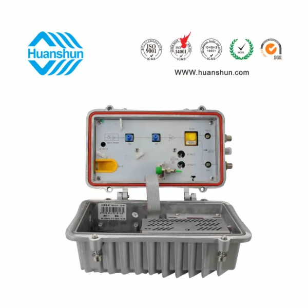 YGS86/10040R野外型二輸出光接收機是適應NGB網絡構架EPON+EOC而設計的低光功率光接收產品。本機選用光電一體化模塊或高靈敏度光電管,低噪聲前置砷化鎵放大芯片,末級采用英國OEI砷化鎵功率倍增放大模塊,最大輸出電平可達2×102dBuV(YGS10040R);本機還配置高精度避雷保護開關電源,光控AGC自動輸出電平控制,光接收功率LED數碼顯示,EOC插入器(數據通道5~65MHz)。由于主要器材性能優越,加上精心設計的電路配合,從而保證了性能指標高,可靠性好。同時,為解決運營商設備管理和雙向網改造之便,本機增加了可選型網管應答器有EOC雙工器,通過以太網絡可實現HFC網管系統監控和EOC插入功能。